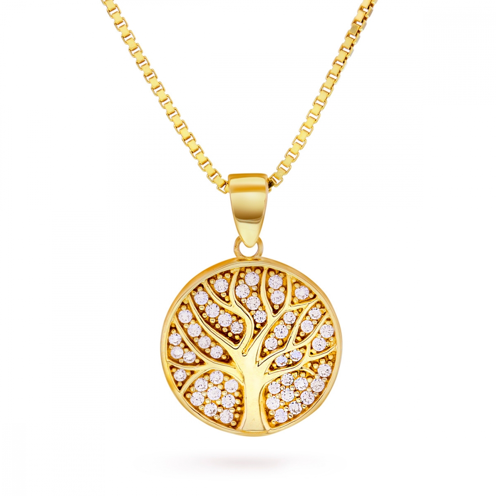 Livets træ i gult guld med cz. Forgyldt sølvkæde på 42+3cm medfølger.